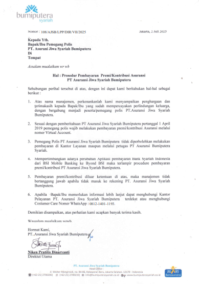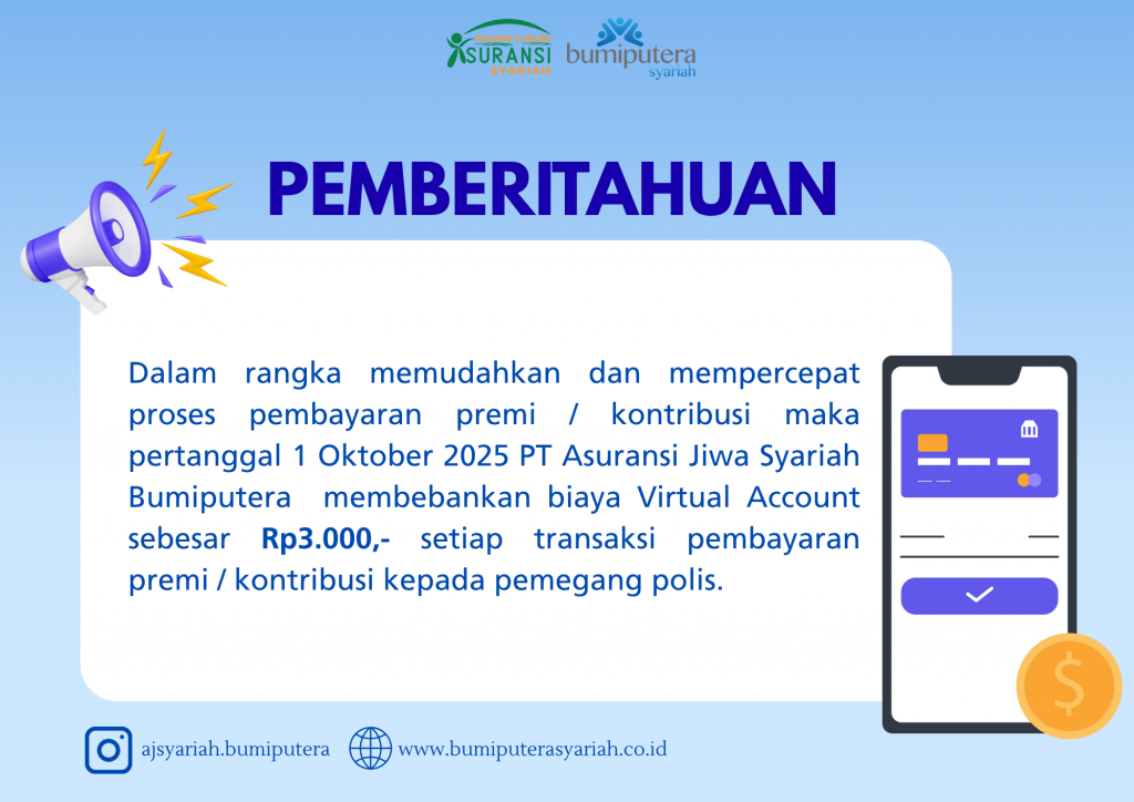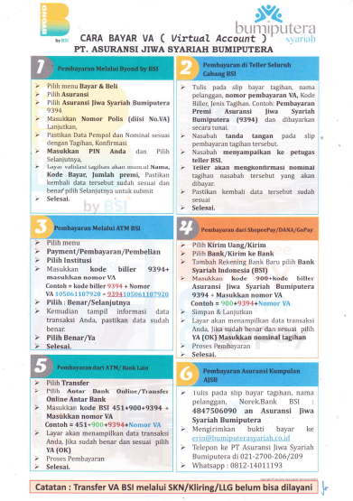 1. Pembayaran Kontribusi dilakukan secara penuh sebelum atau pada tanggal jatuh tempo kepada Perusahaan melalui nomor Virtual Account (VA) yang tertera pada masing-masing Polis.